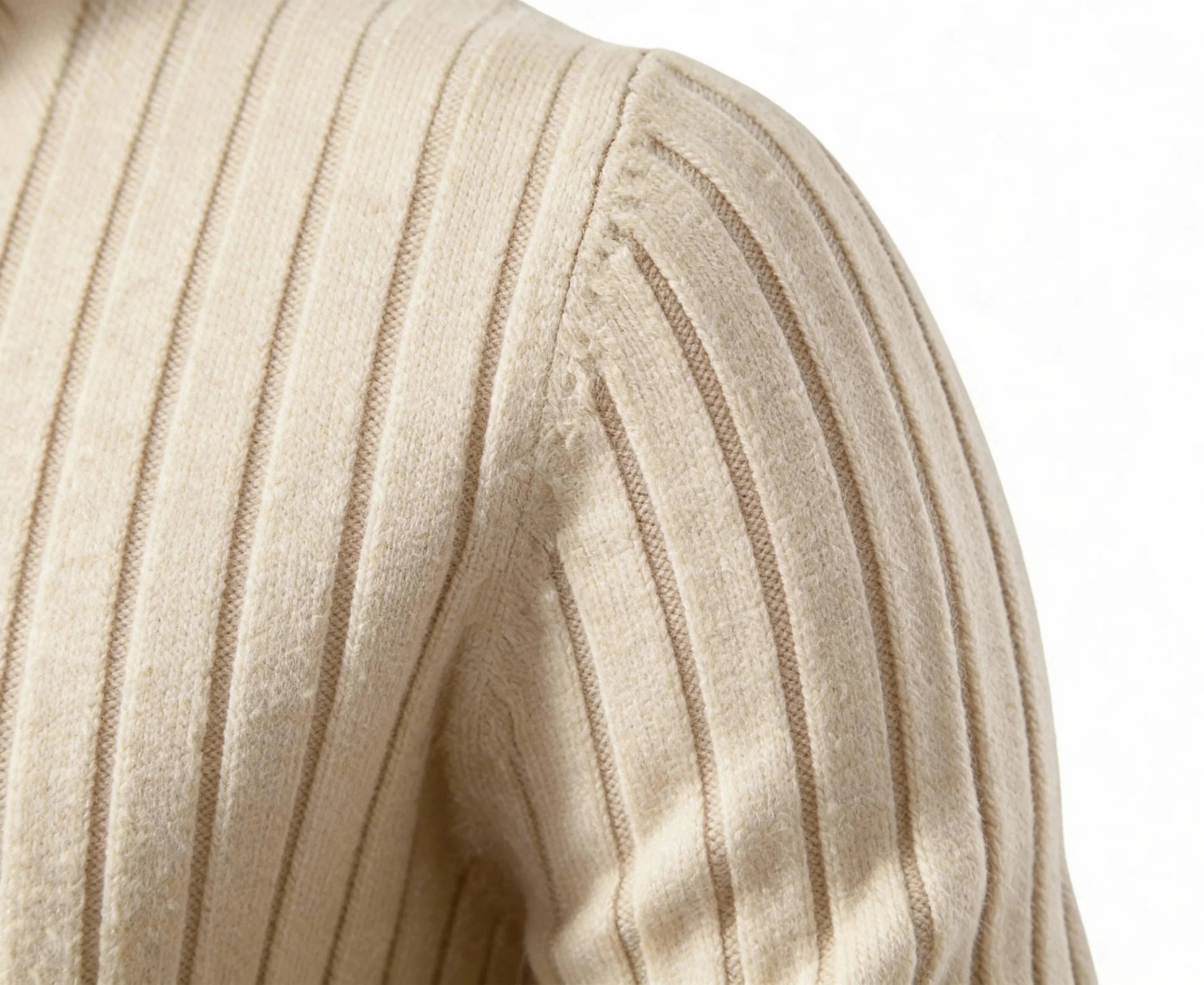 Every stitch placed with purpose. Ribbed texture flows seamlessly from shoulder to cuff with subtle depth that catches light. Organic transitions, no shortcuts—quiet craftsmanship in every groove.