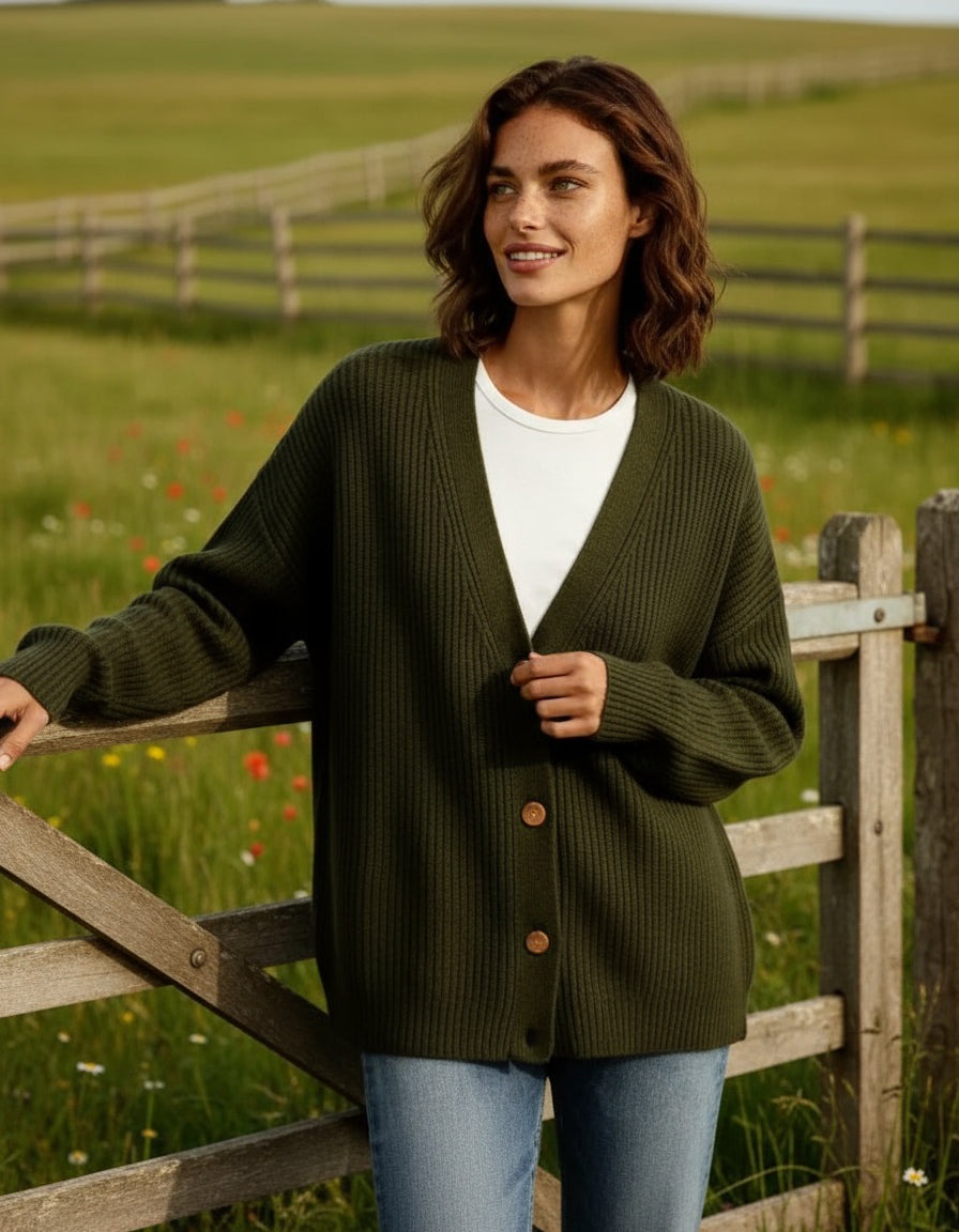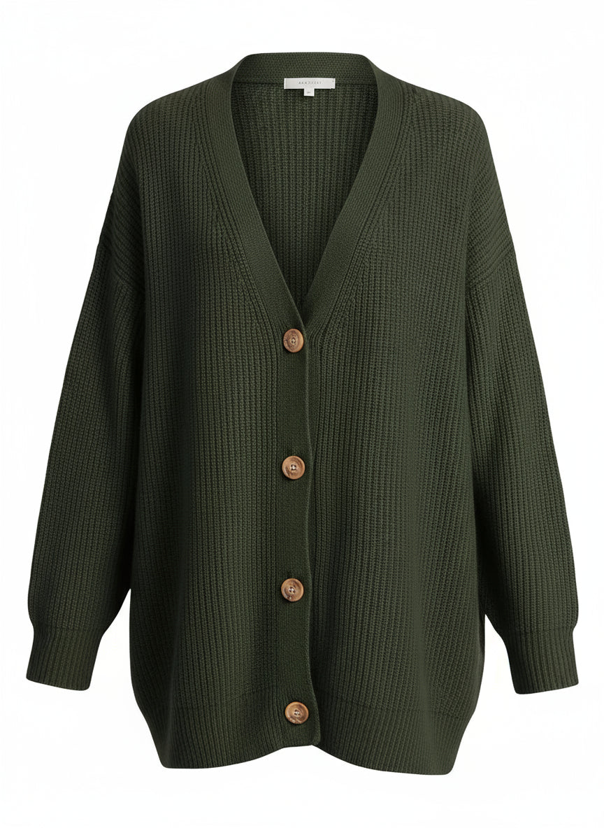 Every stitch holds purpose. The deep ribbed surface, the refined weight of the yarn, the natural grain of the buttons — together they tell a story of craft that values touch as much as sight. Its presence is quiet, its impact lasting — a tactile expression of modern refinement.